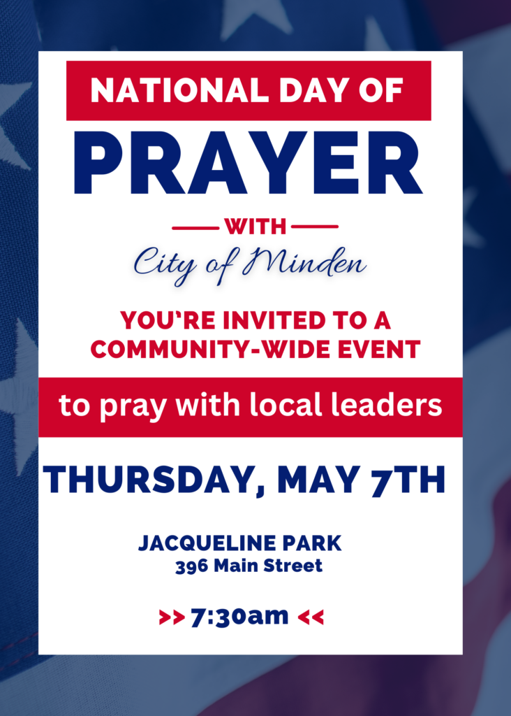 Join us for National Day of Prayer as the City of Minden hosts a special community-wide gathering on Thursday, May 7th at Jacqueline Park.