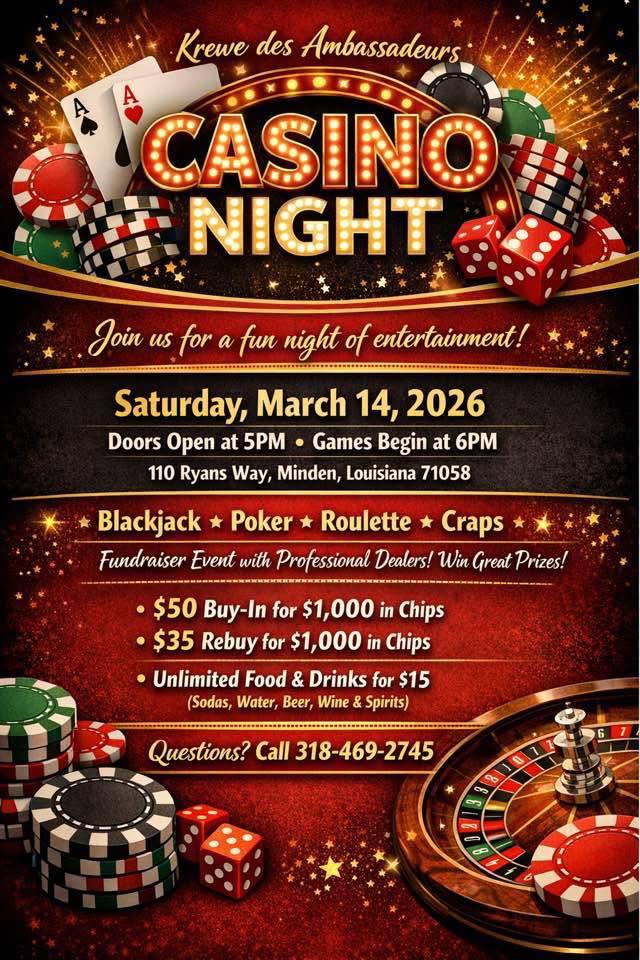Join us for a fun night of entertainment! Saturday, March 14th Doors Open at 5PM Games Begin at 6PM Questions? Call 318-469-2745